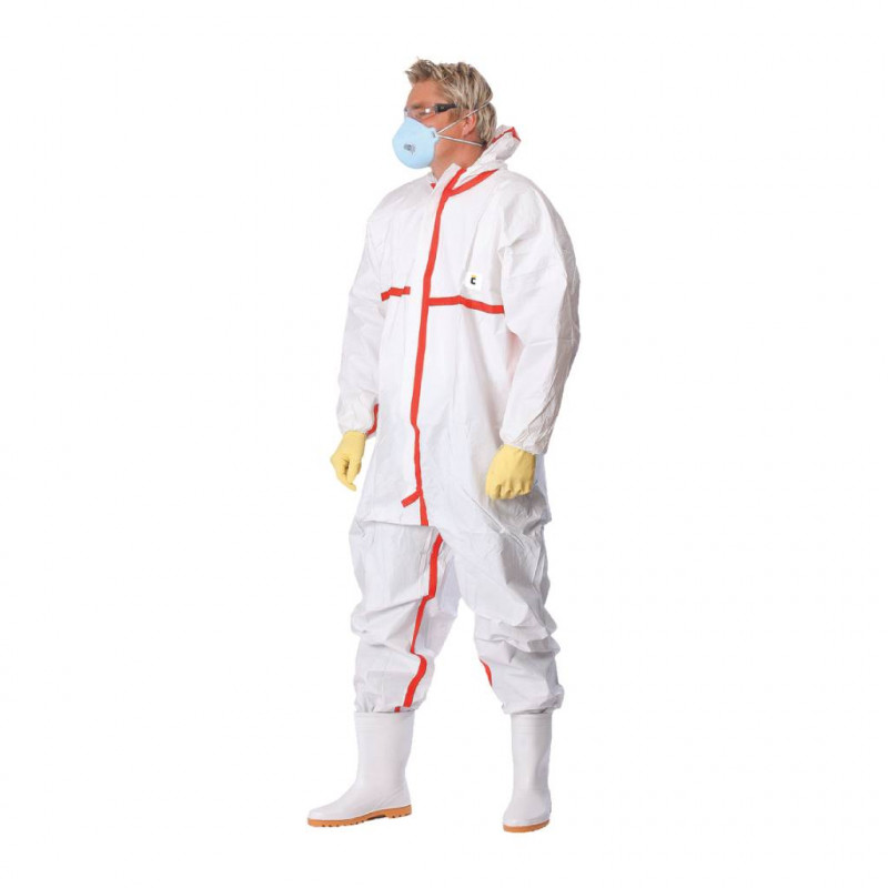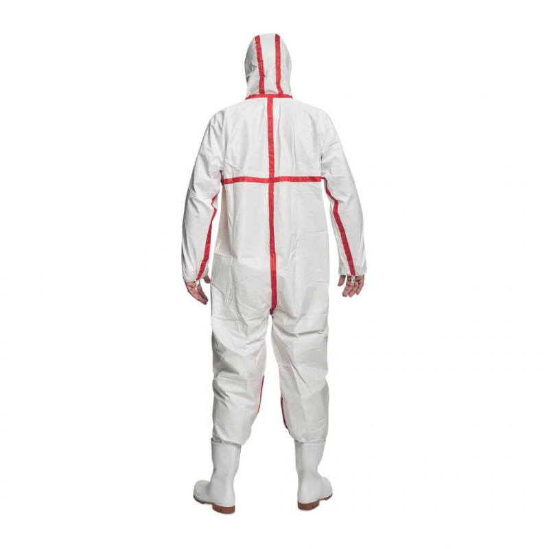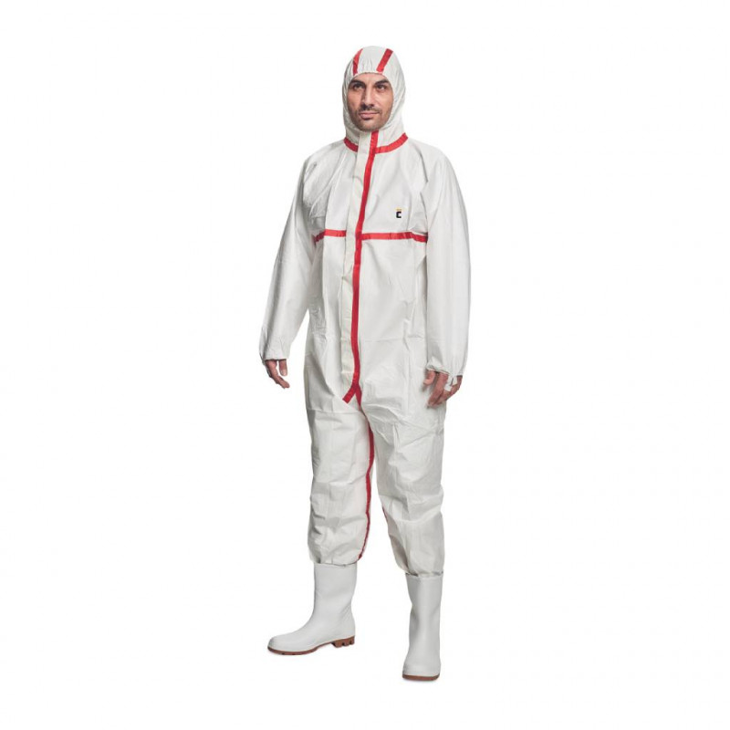 Căptuşeală microporoasă permeabilă la abur, cusături etanşate, fenta fermoar autoadezivă, manşete elastice la mâneci şi picioare. Produs testat chimic, aparţine categoriei CE III, tip 4, 5 şi 6, protejat împotriva elementelor radioactive şi penetrării agenţilor patogeni.