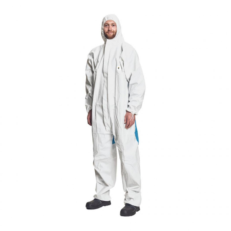 Partea din față este realizată din material laminat cu peliculă microporoasă, partea din spate este confecționată din material de culoare albastru SMMS, care este foarte respirabil; respirabilitatea îmbunătățește foarte mult confortul utilizatorului la locul de muncă; sunt bucle pentru degetul mare în manșete pentru a asigura potrivire perfectă a mânecilor