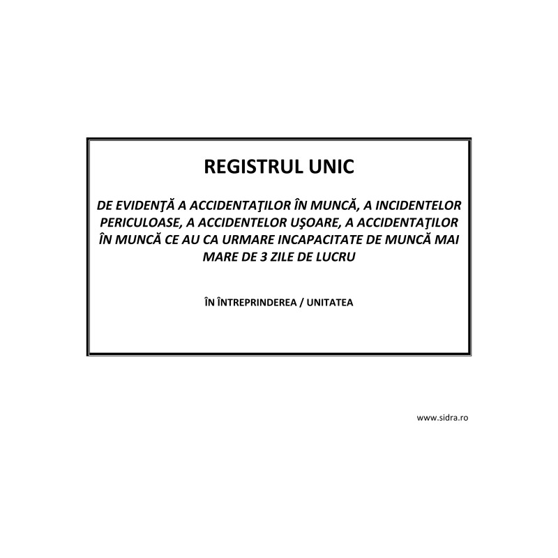 Registrul unic de evidență a accidentaților în uncă este un document obligatoriu pentru toate organizațiile în care există angajați. Acest registru este folosit pentru a înregistra toate accidentele de muncă suferite de angajați, inclusiv accidentele ușoare și grave, cu sau fără incapacitate temporară de muncă.