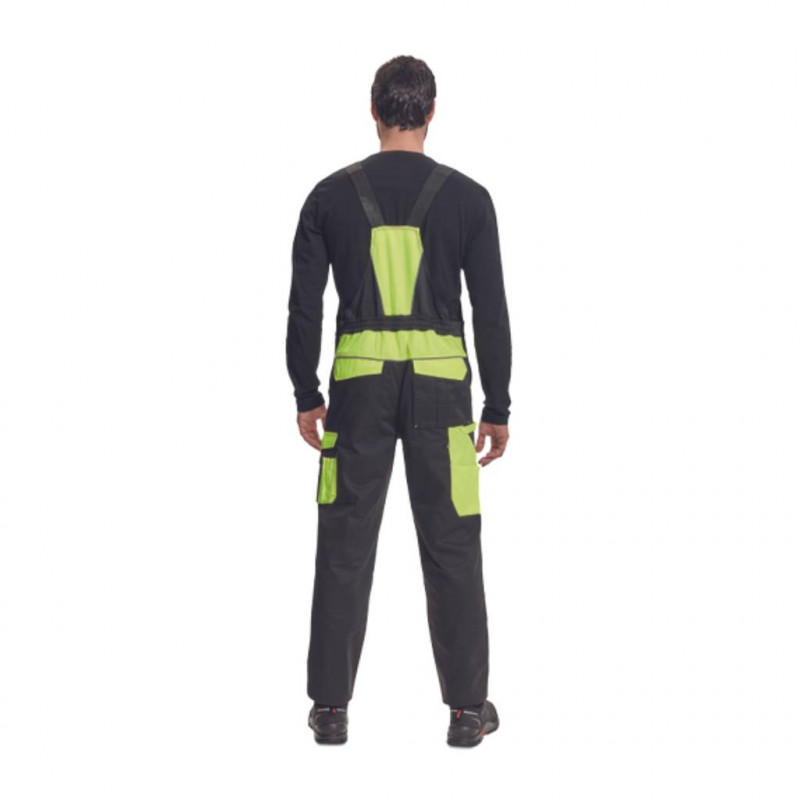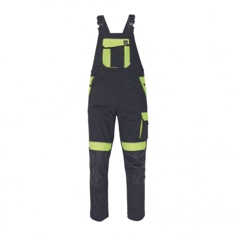 Bretele late cu catarame din plastic; 2 buzunare laterale, 1 buzunar dublu pe coapsa stângă; 1 buzunar mare la piept, 2 buzunare la spate, 2 buzunare mici la spate pe coapsa dreaptă; conducte reflectorizante; Întărirea părților genunchiului Oxford 600D cu buzunare cu clapă pentru introducerea genunchierelor; lungime extensibilă a picioarelor.
